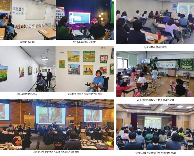 요즘처럼 장애인예술이 활동할 수 있는 기회가 적었던 시절에 그녀는 장애인미술 강사 양성 교육과 직장내 장애인 인식개선 강사 교육을 받고 자격증을 취득한 후 종로장애인복지관 문화학교 미술 강사와 해오름장애