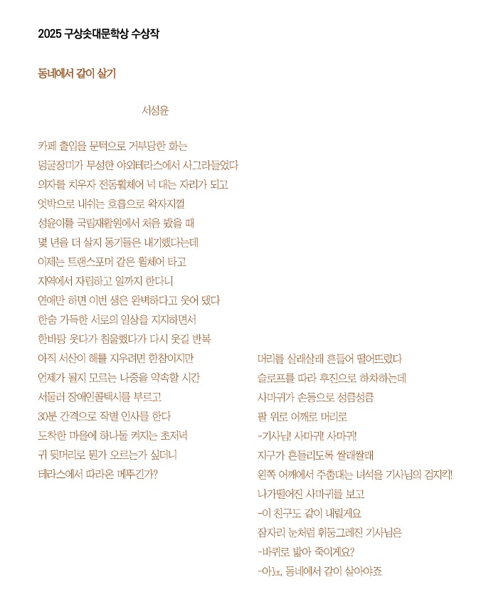 2025 구상솟대문학상 당선작으로 서성윤의 <동네에서 같이 살기>와 고명숙의 <운명의 기도>를 선정했습니다.