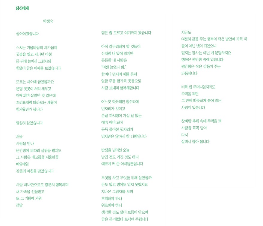 시집 마지막에 놓은 <당신에게>라는 시는 박정숙 그녀의 65년 인생이 고스란히 담겨 있다.